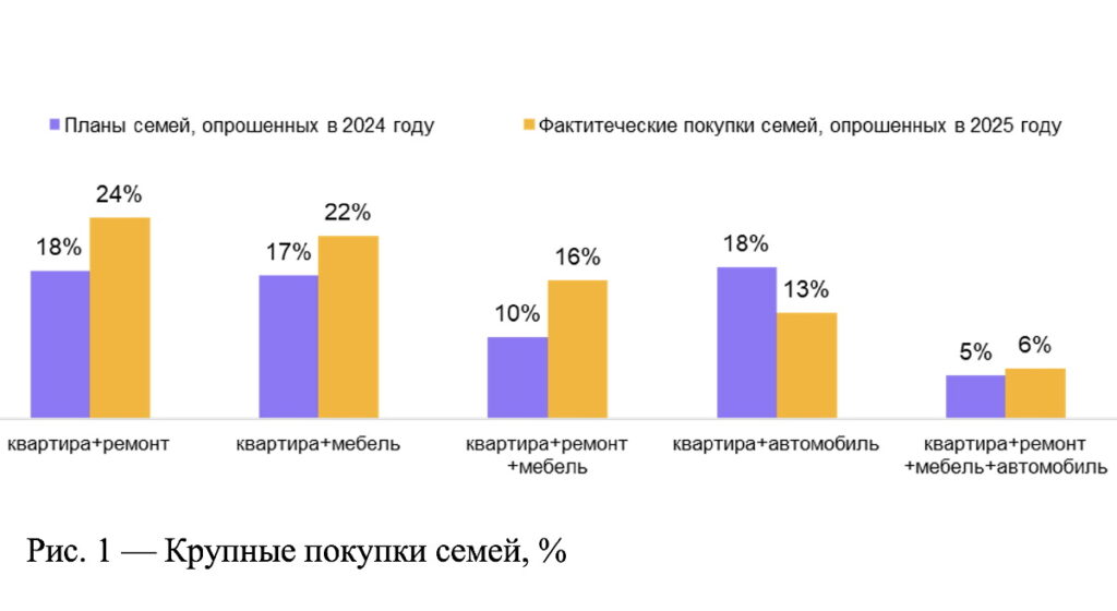 На этапе планирования многие семьи хотели совместить покупку квартиры с другими крупными расходами: 18% — с приобретением автомобиля, 18% — с ремонтом, 17% — с меблировкой, около 8% — с приобретением частного дома. Однако на практике приоритеты сместились в сторону благоустройства нового жилья. Так, автомобиль взяли лишь 13% респондентов, а вот ремонт сделали уже 24% семей и мебель купили 22%. Покупка загородной недвижимостью оказалось редким сценарием — около 2%.