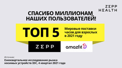 Компания Zepp Health (NYSE: ZEPP), один из мировых лидеров в области интеллектуальных носимых устройств и технологий в области здравоохранения, завершила последний квартал 2021 г. очередным периодом высокого и устойчивого роста и, согласно новым данным корпорации International Data Corporation (IDC, Worldwide Quarterly Wearable Device Tracker), вошла в пятерку лидеров по международным поставкам наручных часов для взрослых.